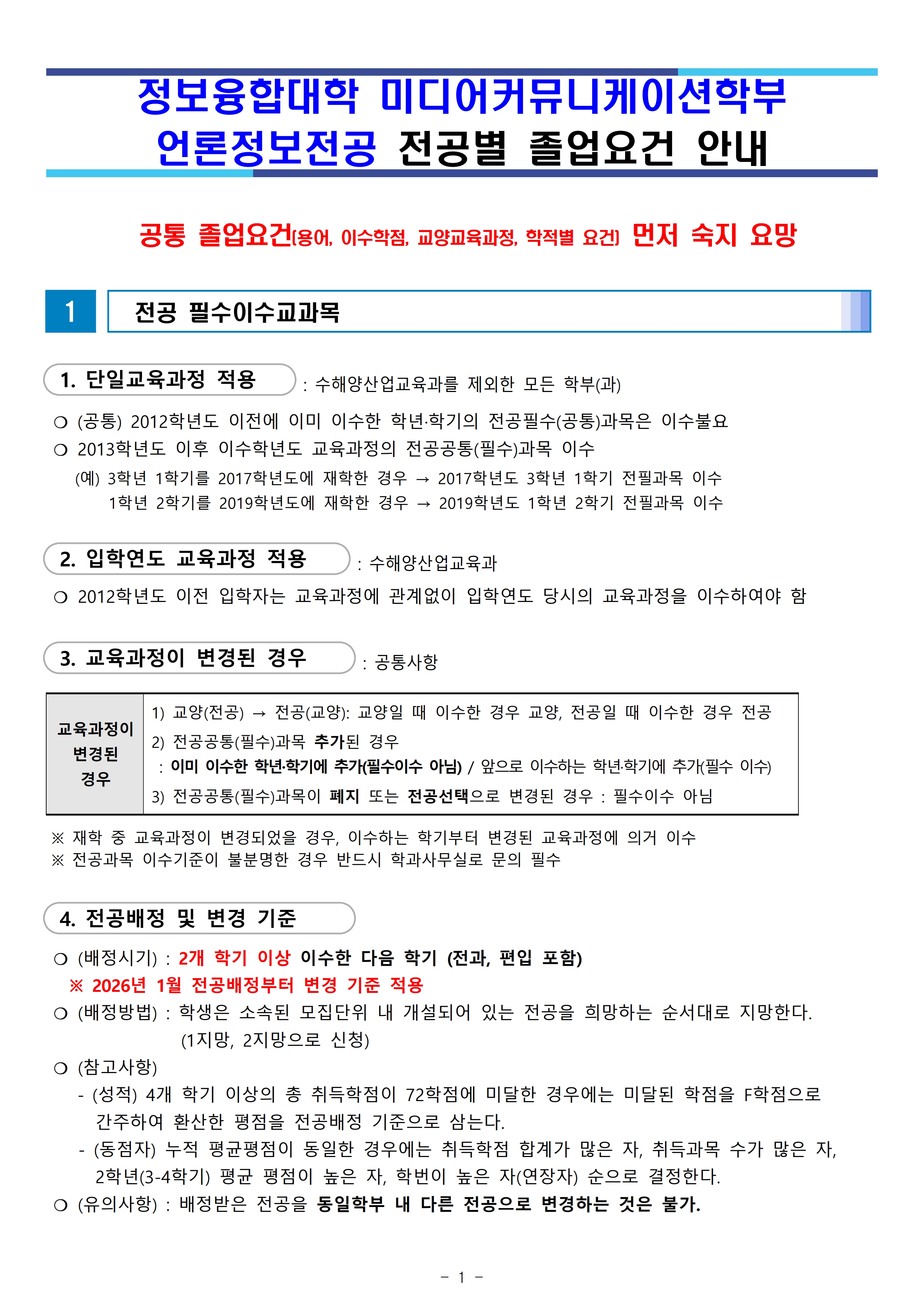 미디어커뮤니케이션학부 언론정보전공 전공별 졸업요건 안내