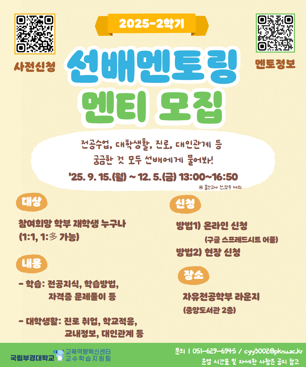 2025-2학기 "선배 멘토링 프로그램" 신청 안내 2025-2학기 “선배멘토링 프로그램”을 아래와 같이 운영하오니 많은 학부(과) 재학생들의 참여 부탁드립니다. 가. 개요 1) 사업내용: 학과별 우수 재학생을 멘토로 선정, 자유전공학부 라운지에 상주하며 멘티를 대상으로 학업 및 대학생활에 대한 상담을 1:1또는 1:多형태로 실시 2) 운영기간: 2025. 9. 15.(월) ~ 12. 5.(금)(10주간) ※ 중간고사 전·당주 제외 3) 운영장소: 자유전공학부 라운지(중앙도서관 2층) 4) 운영내용: 전공학습, 학습방법, 자격증 문제풀이 등 학습 멘토링 및 진로취업, 학교적응, 교내정보, 대인관계 등 대학생활 전반에 대한 멘토링
