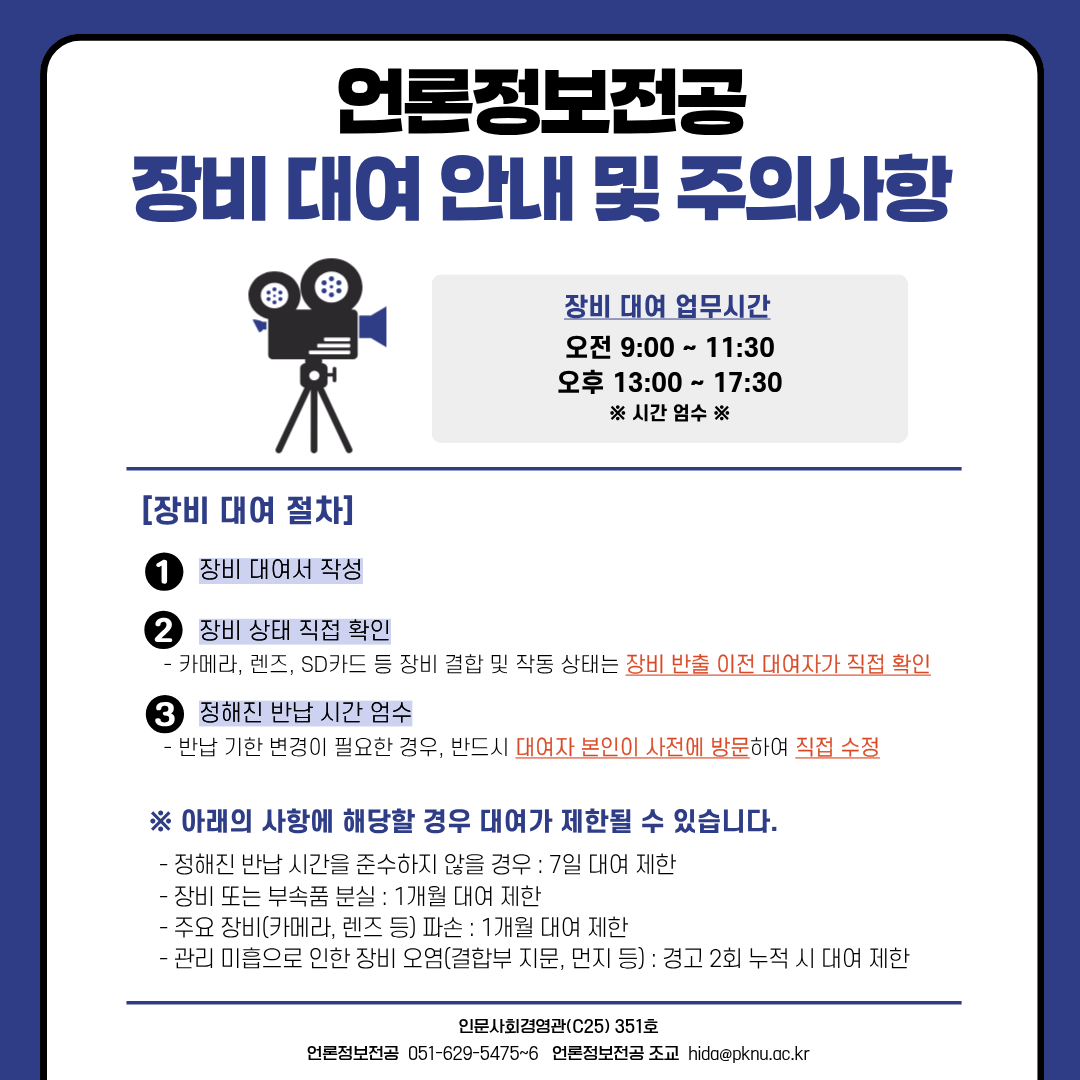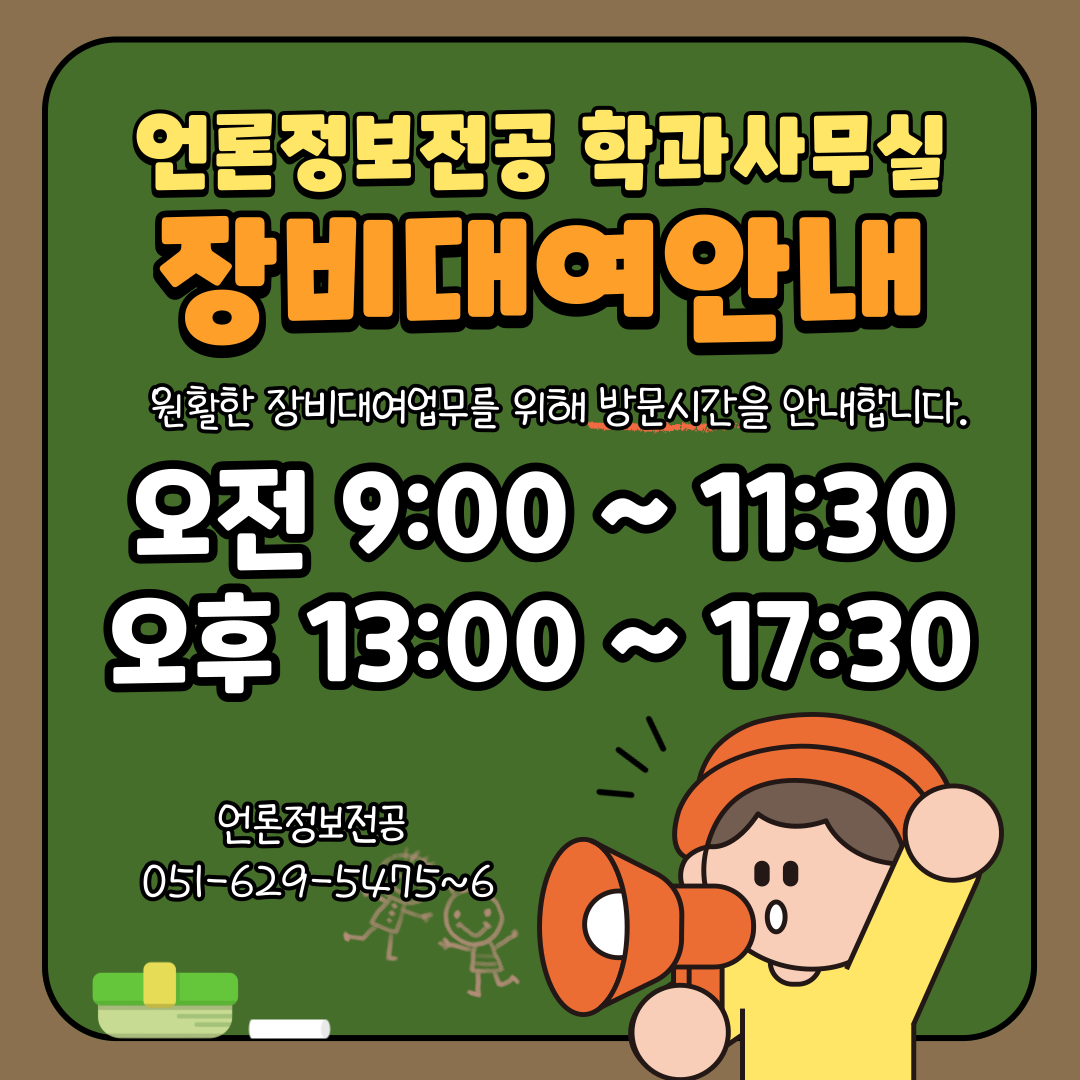 언론정보전공 학과사무실에서 원활한 장비대여 업무를 위해 방문시간을 안내합니다.