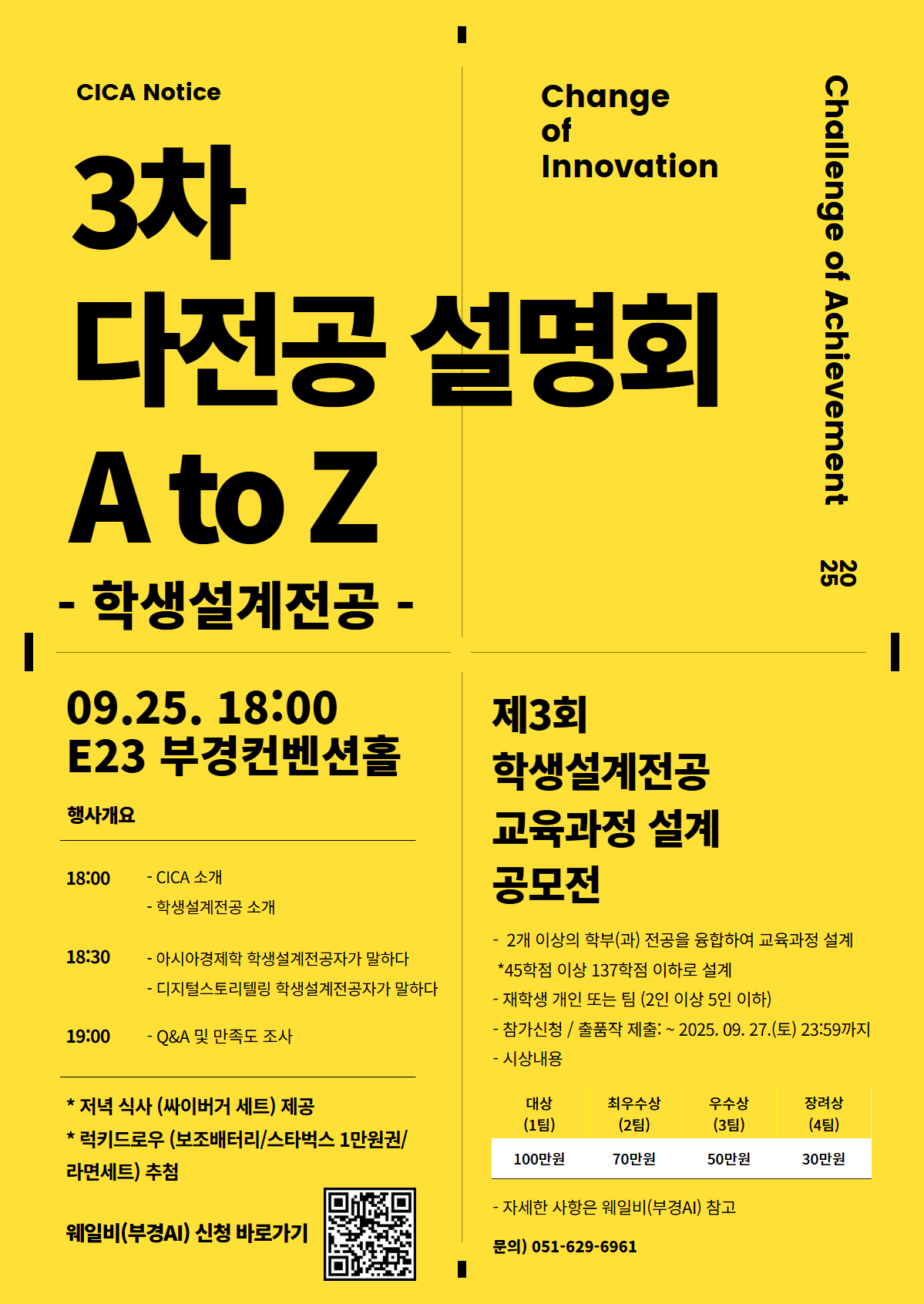 2025학년도 제3회 다전공 설명회 개최 안내 가. 운영일시: 2025. 9. 25.(목) 18:00 ~ 나. 운영장소: 부경컨벤션홀 다. 참여대상: 학부 재학생 및 휴학생 50명 라. 신청방법: 부경AI(웨일비) 신청 마. 주요내용 - 학생설계전공 제도 안내 - 학생설계전공 이수자의 교육과정 설계 사례 발표 - 2025학년도 2학기 학생설계전공 신청 방법 안내(부경AI) - 기타 질의 응답 등