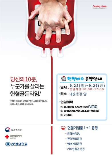 2025-2학기 국립부경대 「헌혈 행사」안내 국내 적정량 혈액확보에 도움을 주고, 생명존중의 공동체 정신을 고취하고 자 우리대학 구성원들을 대상으로 아래와 같이 2025-2학기 헌혈행사를 실시하오니 많은 관심과 참여바랍니다. 가. 행사일시: 2025. 9. 22.(월)~ 9. 26.(금) 10:00~17:30 나. 행사장소: 대운동장 인근 헌혈버스(신분증 또는 학생증 지참) 다. 헌혈혜택 - (봉사시간) 헌혈 1회당 4시간 - (혈액검사) 혈액형, 간염, 간기능, 총단백 검사 등 - (지급품) 헌혈증서, 기념품, 음료, 다과 등 - (기타) 군입대 가산점