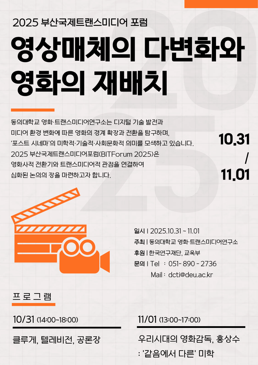 2025 부산국제트랜스미디어 포럼 개최 - 영상매체의 다변화와 영화의 재배치 <영상매체의 다변화와 영화의 재배치>라는 주제로, 영화사적 전환기와 트랜스미디어적 관점을 연결하는 포럼이 개최됩니다. 관심있는 분들의 많은 참여 부탁드립니다. - 일정 : 10월 31일(금) ~ 11월 1일(토) 이틀간 - 상세 프로그램 내용은 아래와 같습니다. 세션 1 (1일차) : 클루게, 텔레비전, 공론장 세션 2 (2일차) : 우리 시대의 영화감독, 홍상수 : '같음에서 다른' 미학 - 개최 장소 : 부산영상산업센터 컨퍼런스 홀 (예정으로, 아직 확정이 되지 않아 포스터에는 들어가 있지 않습니다.) 국제 포럼인 만큼 여러 해외 게스트 분들 및 영화 평론가분들이 패널로 참석하셔서 주제와 관련하여 대담을 나눌 예정입니다.