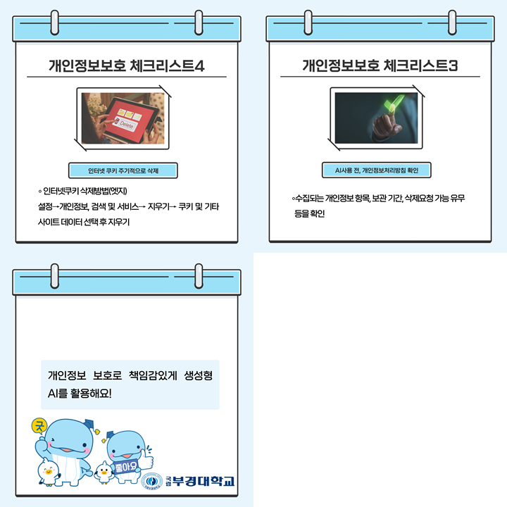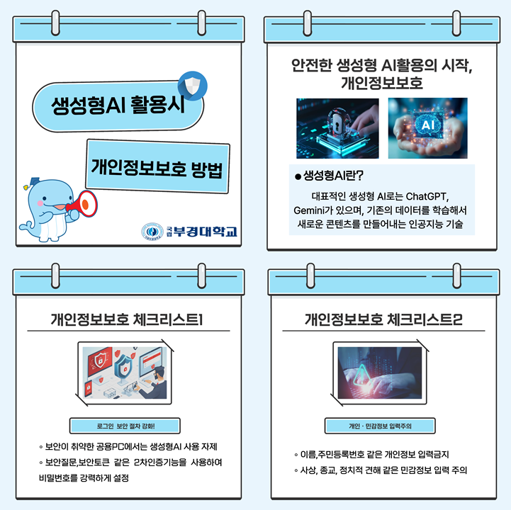 2025년 개인정보보호 카드뉴스 배포 최근 생성형 AI활용이 늘어남에 따라 우리 대학의 개인정보보호 역량 강화 및 인식 제고를 위하여 카드뉴스를 제작/배포하오니, 학생들의 참고 바랍니다.