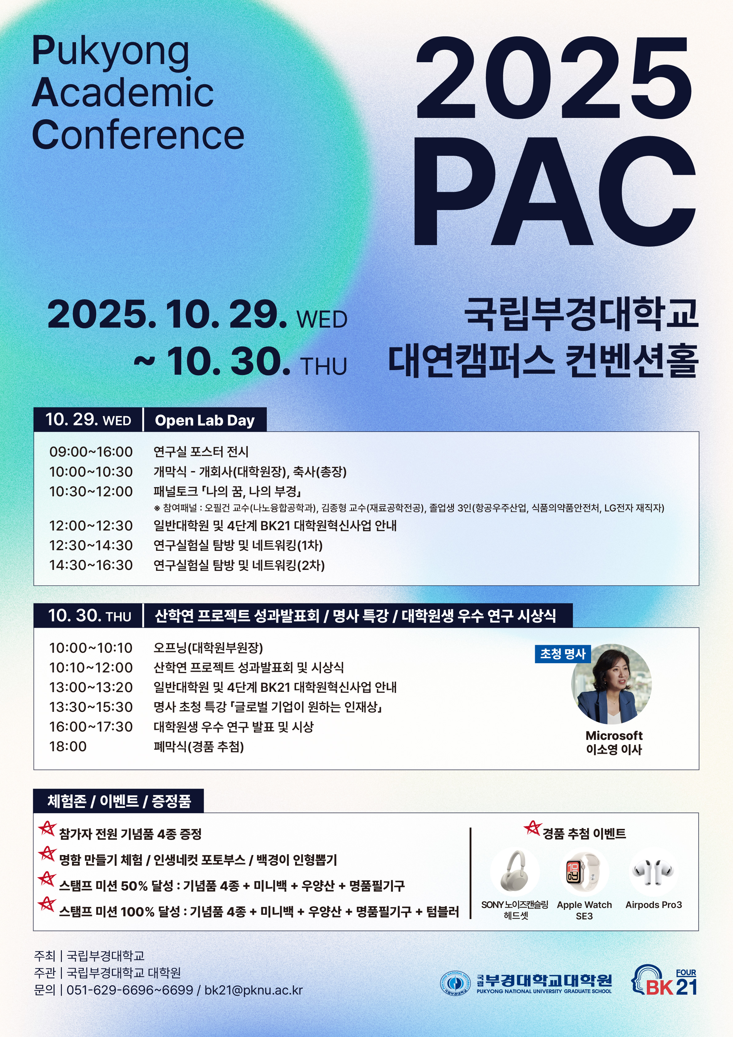 [행사 개요] - 행사명: 2025 PAC(Pukyong Academic Conference) - 일 시: 10. 29.(수) 09:00~16:30 / 10. 30.(목) 09:00~18:00 - 장 소: 대연캠퍼스 부경컨벤션홀 - 대 상: 국립부경대학교 대학원생, 학부생, 수료후연구생 등 [출석인정 관련 사항 안내]