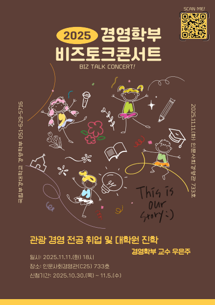 가. 행사 개요 - 일 시: 2025.11.11.(화) 18:00 - 장 소: 국립부경대학교 인문사회경영관(C25) 733호 - 주 최: 경영대학 경영학부 - 참석대상: 국립부경대학교 재학생 40여명 - 특강주제: 관광 경영 전공 취업 및 대학원 진학 - 특강강사: 경영학부 우은주 교수 - 신청방법: 국립부경대포털(portal.pknu.ac.kr) 로그인 → 부경AI → 비교과(웨일비) → 비교과 프로그램(비즈토크콘서트) → 신청하기