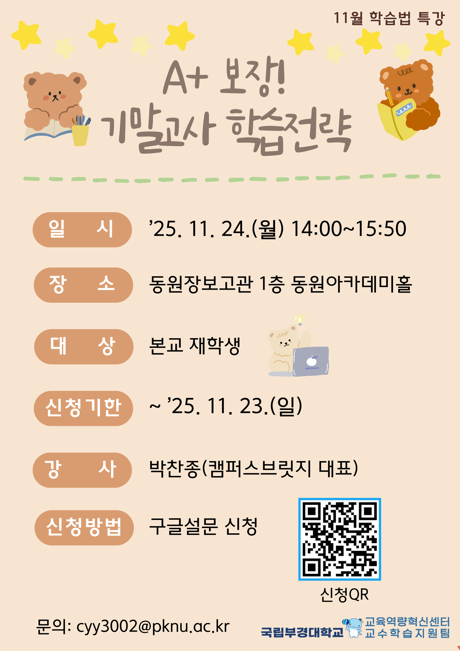 가. 일 시: ’25. 11. 24.(월) 14:00 ~ 15:50 나. 장 소: 대연캠퍼스 동원장보고관 1층 동원아카데미홀 다. 참여대상: 본교 학부 재학생 라. 신청방법: 구글 설문 신청(https://forms.gle/iyJ24uzjpZGJJKXe9) 마. 신청기한: ~ ’25. 11. 23.(일) 바. 특강주제: A+보장! 기말고사 학습전략 사. 강 사: 박찬종(캠퍼스브릿지 대표) 붙임 홍보 포스터 1부. 끝. |