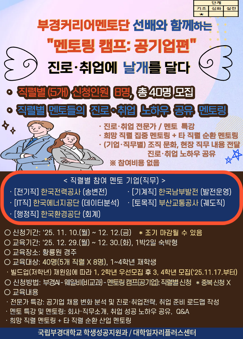 2025년 재학생맞춤형고용서비스 사업 「부경커리어멘토단 멘토링 캠프:공기업」참여자 모집 진로·취업 전문가 특강과 공기업 직렬별(전기직, 기계직, 토목직, IT직, 행정직) 현직자의